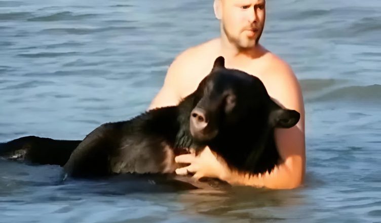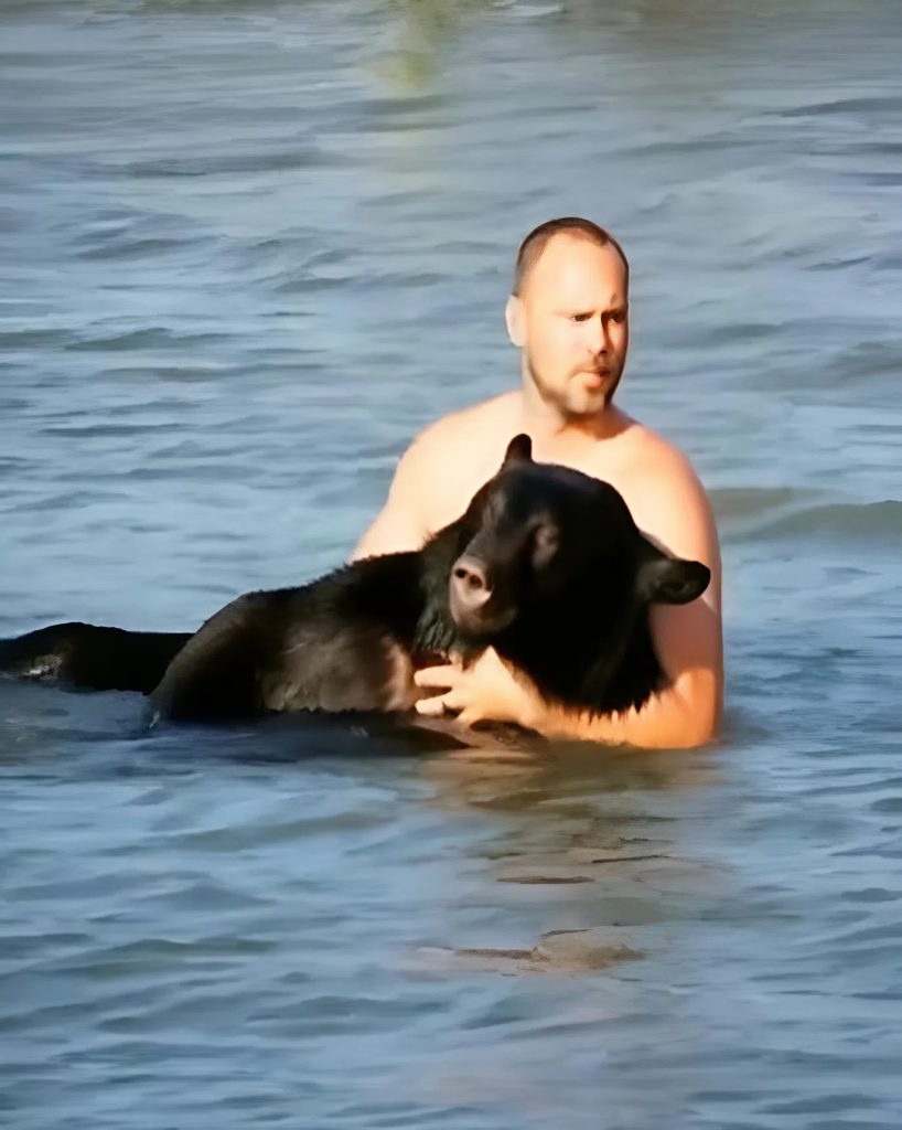 Byl to neuvěřitelný pohled: člověk a obrovský divoký medvěd vedle sebe uprostřed oceánu. Vlny do nich narážely, ale muž nepřestával pomáhat a jemně zvíře směroval správným směrem.