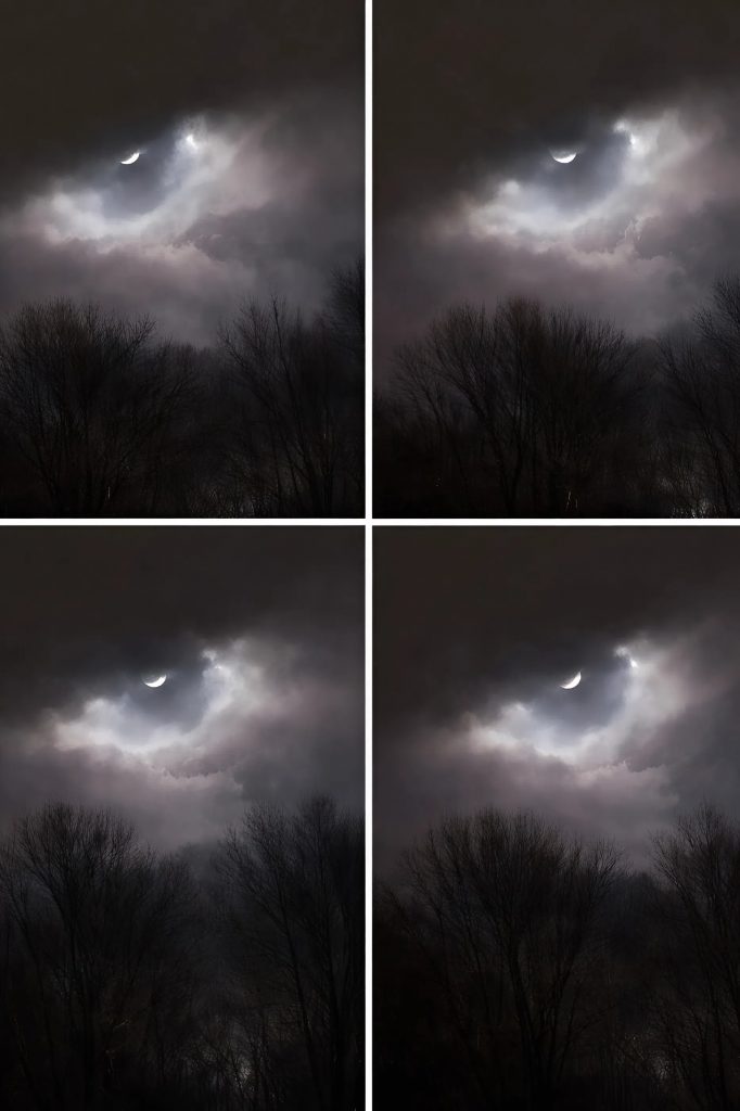 Au premier regard, vous voyez simplement la lune cachée derrière des nuages. Mais observez bien. Pas rapidement. Prenez le temps. Laissez vos yeux s’habituer à l’obscurité. Ce que vous allez remarquer pourrait vous mettre mal à l’aise.